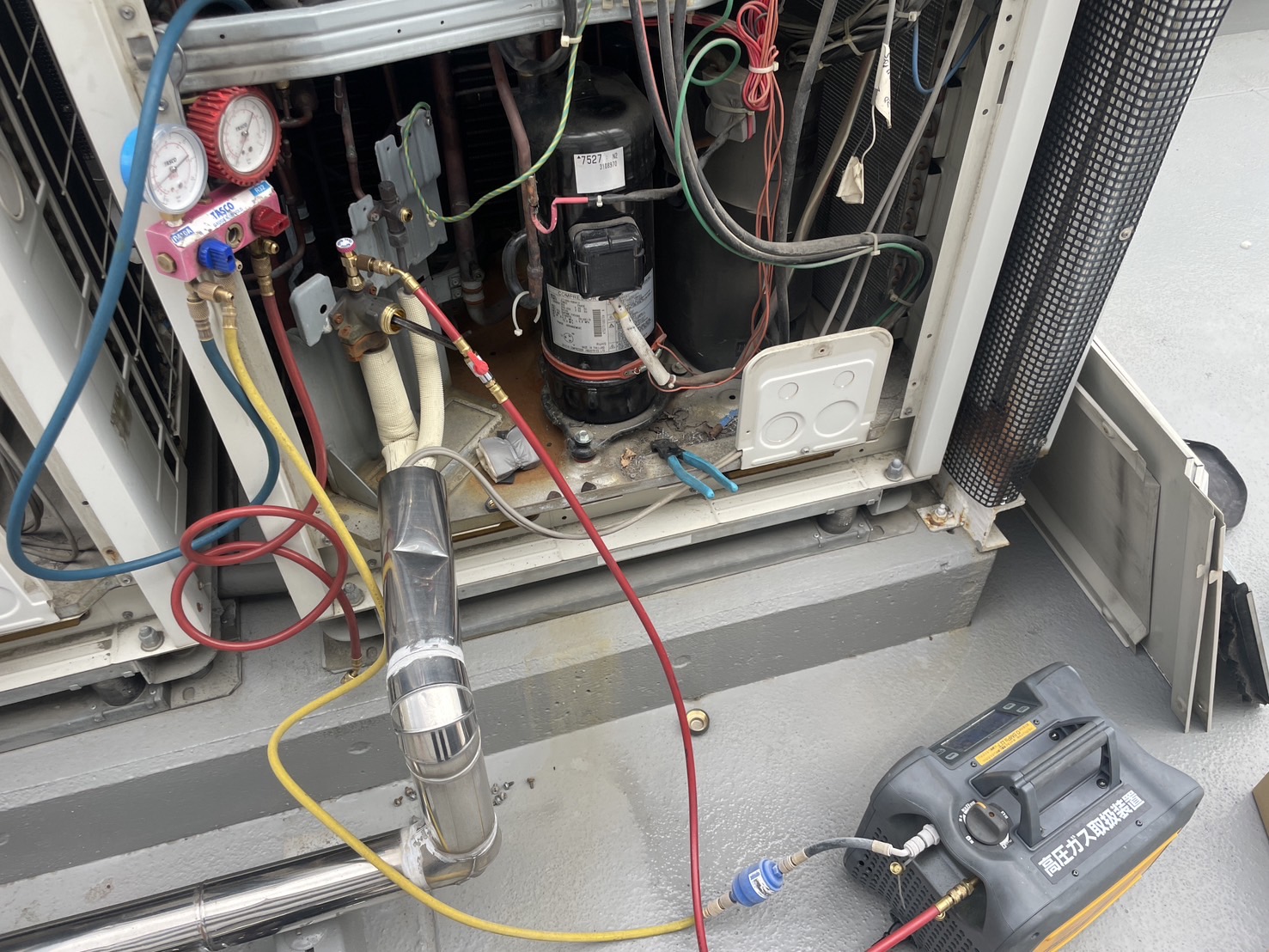 高槻市の保育施設にて、エアコン室外機修理作業を行ないました。